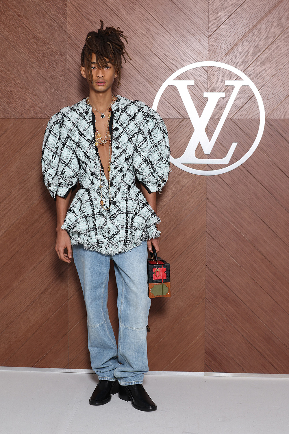 The 26-year-old actor, son of Will and Jada Smith, opted for a gender-fluid look featuring a plaid tweed puff-sleeve jacket from Louis Vuitton’s Spring 2025 womenswear collection.