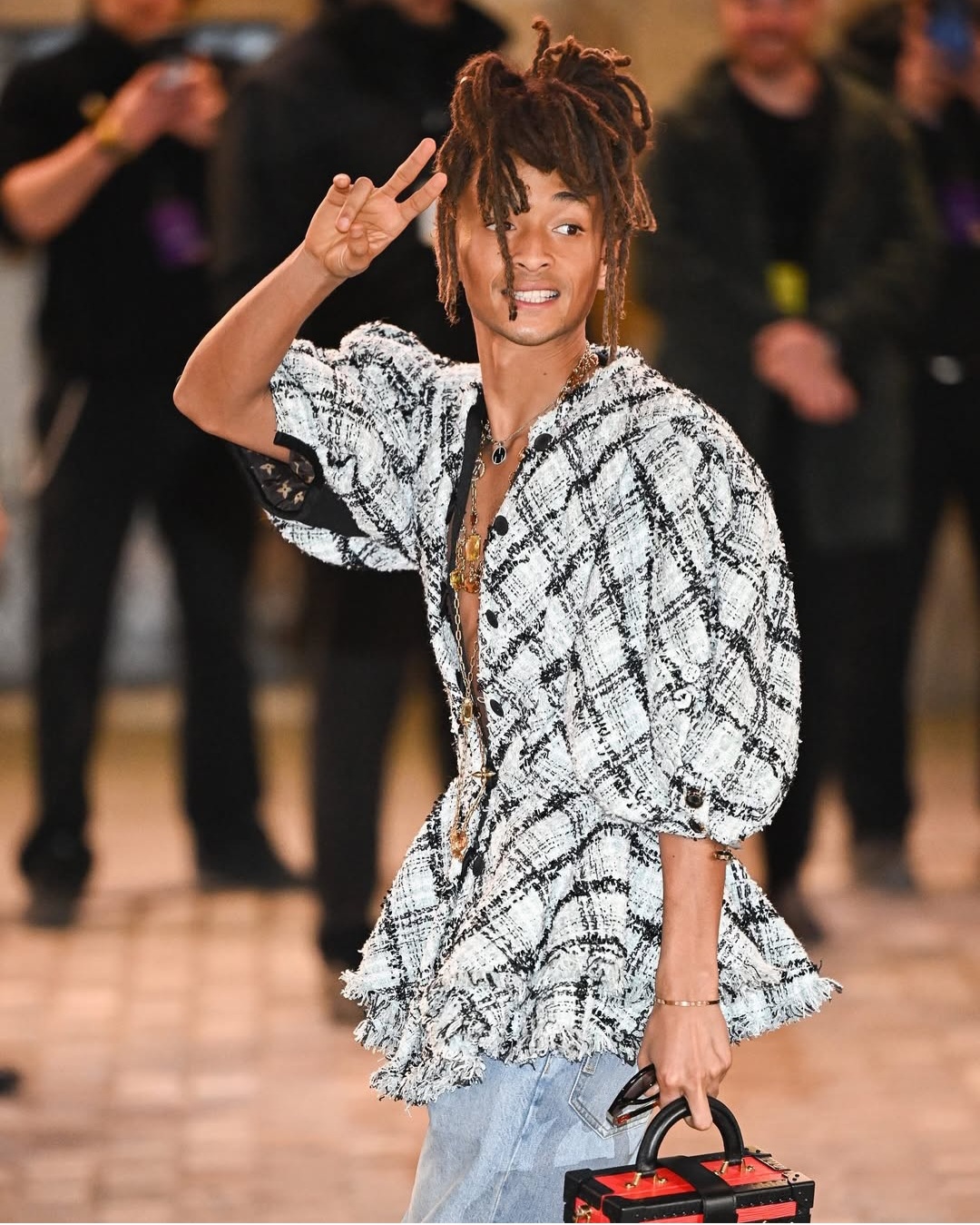The 26-year-old actor, son of Will and Jada Smith, opted for a gender-fluid look featuring a plaid tweed puff-sleeve jacket from Louis Vuitton’s Spring 2025 womenswear collection.