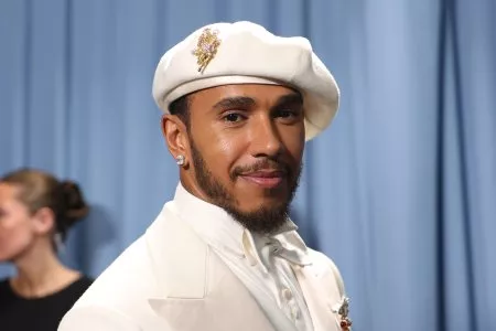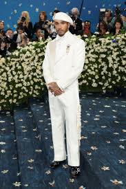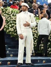 British Formula One champion Lewis Hamilton turned heads at the 2025 Met Gala, arriving in a custom ivory suit by designer Grace Wales Bonner, paired with a matching beret and vintage jewelry.