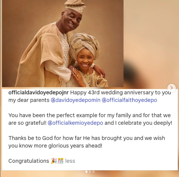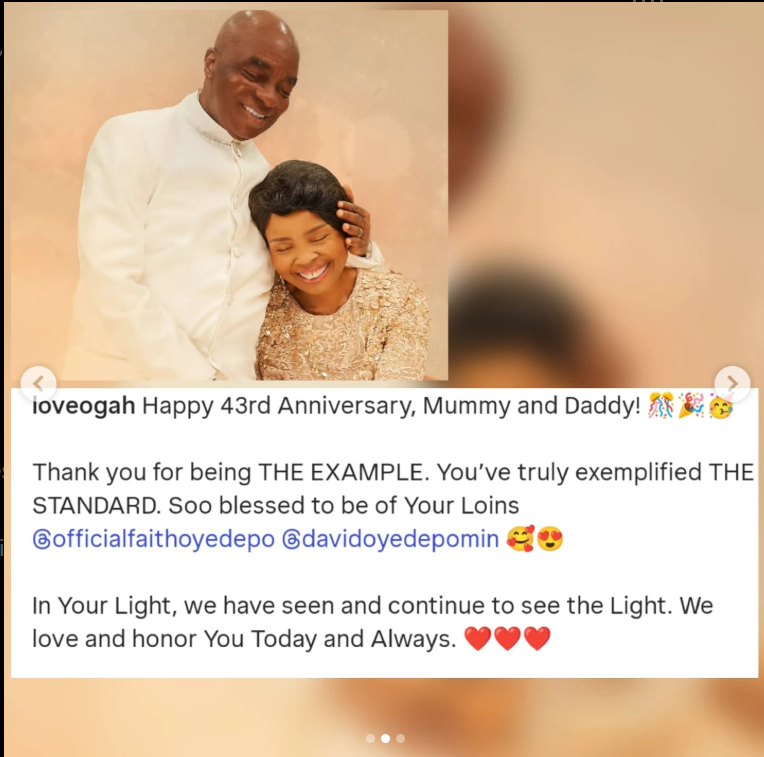 “Happy 43rd wedding anniversary to you, my dear parents. You have been the perfect example for my family, and for that we are so grateful! Kemi and I celebrate you deeply. Thanks be to God for how far He has brought you, and we wish you many more glorious years ahead.”