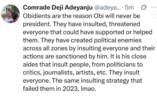 In a post on his X handle this afternoon, Adeyanju said the group has consistently resorted to insulting and threatening people, a “strategy” he believes contributed to Obi’s loss in the last election.