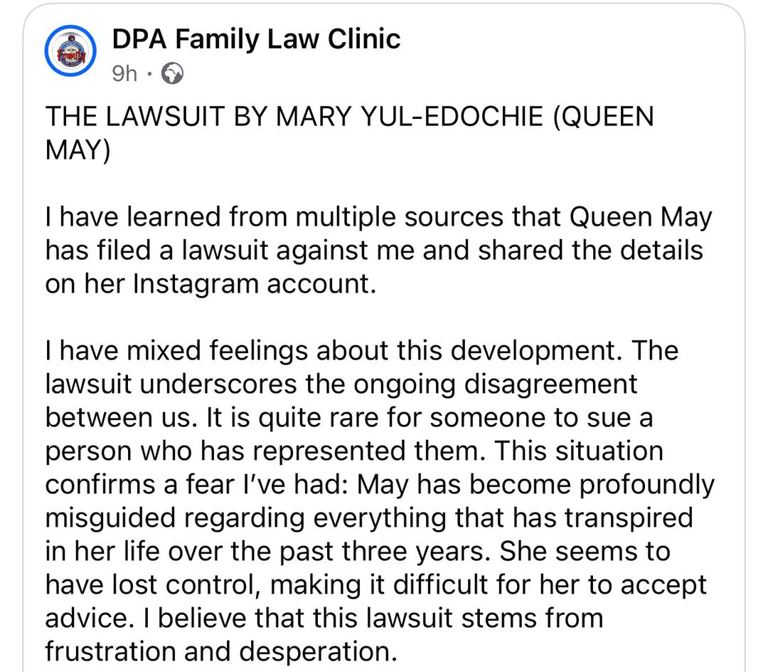 I have learned from multiple sources that Queen May has filed a lawsuit against me and shared the details on her Instagram account.